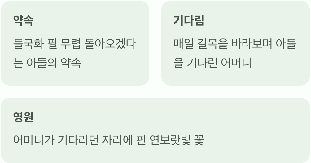 하지만 가을이 되어 산과 들에 연보랏빛 꽃이 만발하도록 아들은 돌아오지 않았고, 어머니는 매일같이 아들이 떠나간 길목을 바라보며 아들을 기다리다 결국 그 자리에서 숨을 거두고 말았습니다. 훗날 사람들은 어머니가 아들을 기다리던 그 자리에 피어난 이 꽃을 보며, 어머니의 애틋한 기다림을 떠올리게 되었다고 합니다.