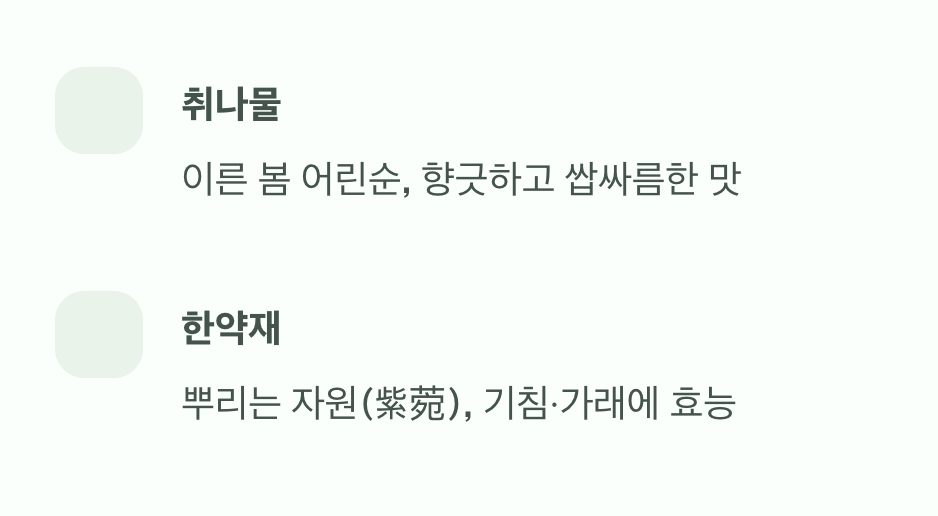 개미취는 이처럼 아름다운 상징을 가졌을 뿐만 아니라, 예로부터 우리에게 아주 이로운 식물이기도 했습니다. 이른 봄에 돋아나는 개미취의 어린순은, 특유의 향긋함과 쌉싸름한 맛이 일품인 ‘취나물’의 한 종류로, 우리 조상들의 봄철 입맛을 돋우는 귀한 반찬이 되어주었습니다.