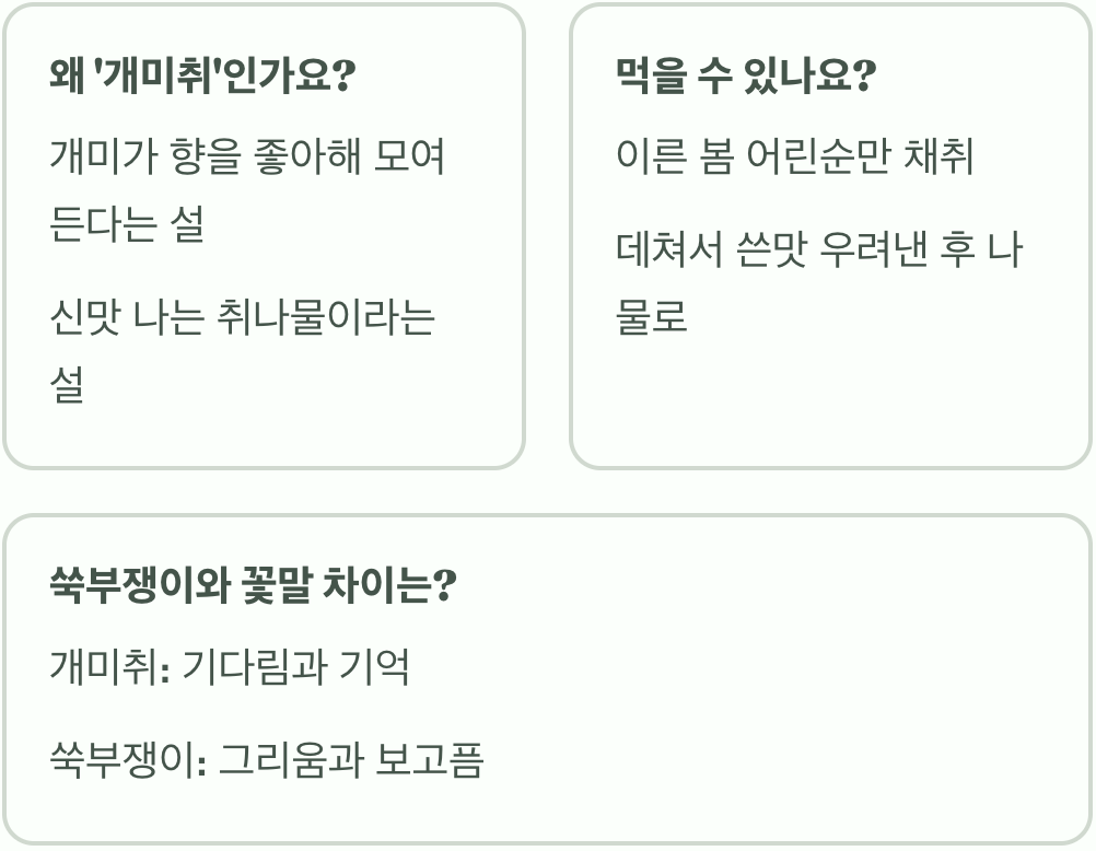 A. 네, 아주 맛있는 봄나물입니다. 다만, 꽃이 피었을 때는 잎과 줄기가 억세져서 먹기 힘듭니다. 반드시 이른 봄에 돋아나는 부드러운 어린순만을 채취하여, 끓는 물에 데쳐 쓴맛을 우려낸 뒤 나물로 무쳐 먹어야 합니다.