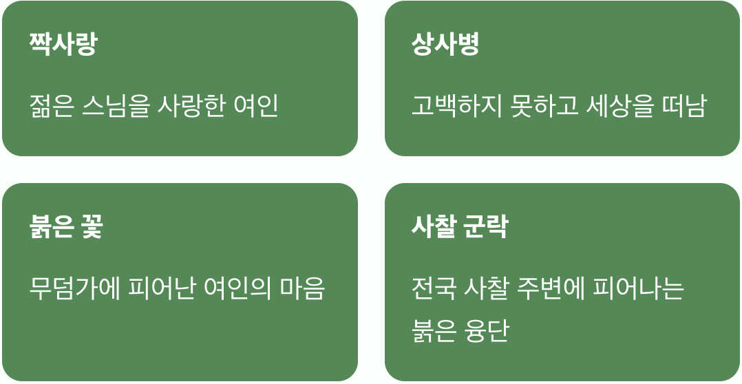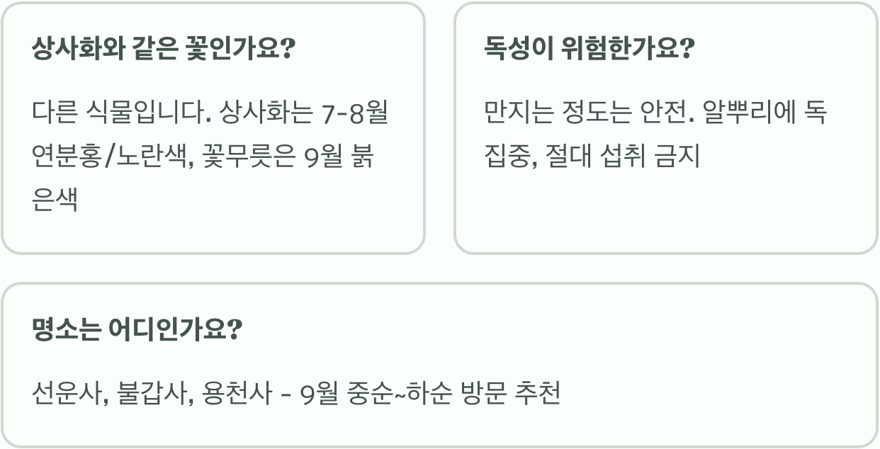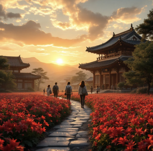 그 후 여인의 무덤가에는 붉은 꽃이 피어났는데, 사람들은 그 꽃이 마치 이루지 못한 사랑에 피를 토하듯 붉게 피어났다고 하여 상사화라고 부르기도 했습니다. 하지만 엄밀히 말하면 상사화와 꽃무릇은 다른 식물입니다. 이 전설 덕분에 전국의 유명한 사찰 주변에는 가을이면 이 꽃들이 군락을 지어 피어나, 여인의 붉은 마음을 대신 전하고 있습니다.