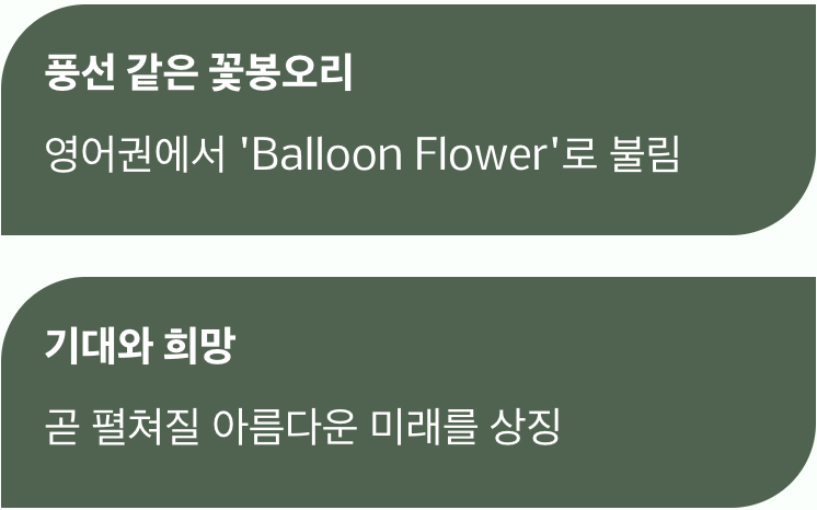 이 터지기 직전의 풍선 같은 모습은, 곧 펼쳐질 아름다운 미래에 대한 ‘기대’와 ‘희망’을 상징합니다. 지금은 비록 움츠리고 있지만, 그 안에는 무한한 가능성과 희망이 가득 차 있다는 것을 보여주는 것이죠. 이처럼 도라지꽃은 우리에게 결과뿐만 아니라, 설레는 마음으로 무언가를 기다리는 과정의 아름다움 또한 소중하다는 것을 일깨워 줍니다.