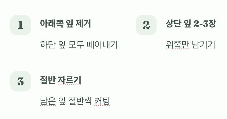 남겨둔 잎들도 그대로 두지 말고 가위로 절반씩 싹둑 잘라주는 것이 좋습니다. 이렇게 하면 광합성은 계속해서 영양분을 만들면서도, 수분이 날아가는 면적을 줄여주어 생존율을 극대화할 수 있습니다. 잎을 자르는 것이 조금 안쓰러워 보여도, 과감하게 정리해 주는 것이 나무 전체를 살리는 지혜로운 해결책입니다.