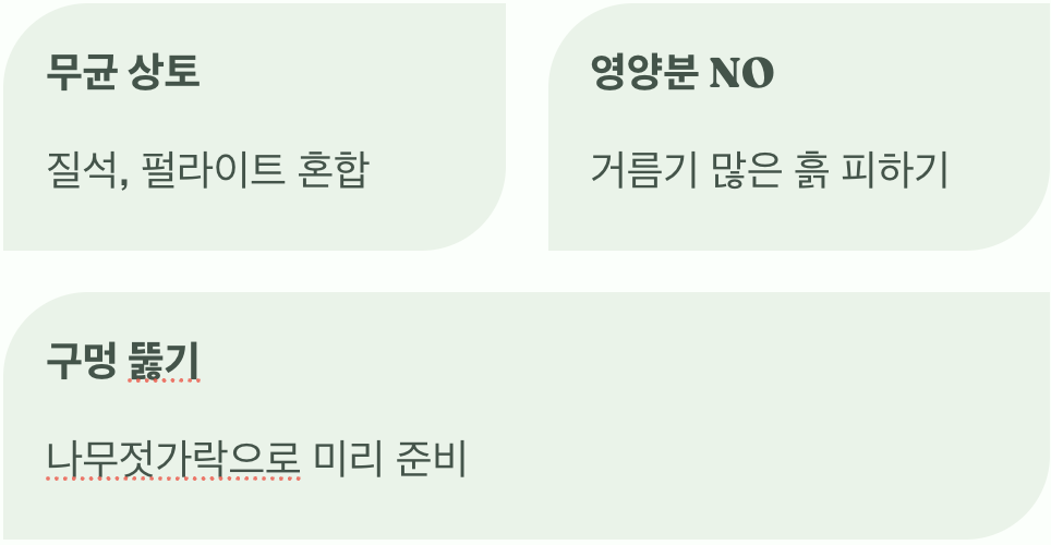 아무 흙이나 화단에서 퍼와서 심으면 흙 속에 있는 곰팡이나 세균 때문에 자른 단면이 썩어버릴 수 있습니다. 영양분이 전혀 없는 깨끗한 무균 상토나 질석, 혹은 펄라이트가 섞인 배양토를 사용하는 것이 안전합니다. 거름기가 많은 흙은 삼투압 현상으로 오히려 뿌리 내리는 것을 방해하므로 피해야 합니다.