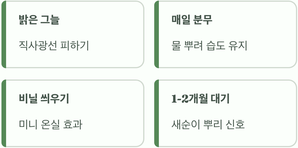 삽목을 마친 화분은 직사광선이 닿지 않는 밝은 그늘에 두어야 합니다. 햇빛을 직접 받으면 온도가 너무 올라가서 가지가 익어버리거나 말라버릴 수 있습니다. 흙이 마르지 않도록 매일 분무기로 물을 뿌려주거나, 투명한 비닐봉지를 씌워 미니 온실을 만들어주는 것도 아주 좋은 방법입니다. 비닐에 구멍을 몇 개 뚫어 숨구멍을 만들어주는 센스도 잊지 마세요.