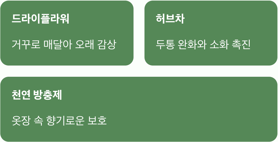 이 허브의 매력은 관상용에서 끝나지 않습니다. 꽃이 만개하기 직전에 수확해서 거꾸로 매달아 말리면 드라이플라워로 오랫동안 감상할 수 있습니다. 잘 말린 꽃잎을 모아 차로 마시면 두통을 없애고 소화를 돕는 훌륭한 건강차가 됩니다.