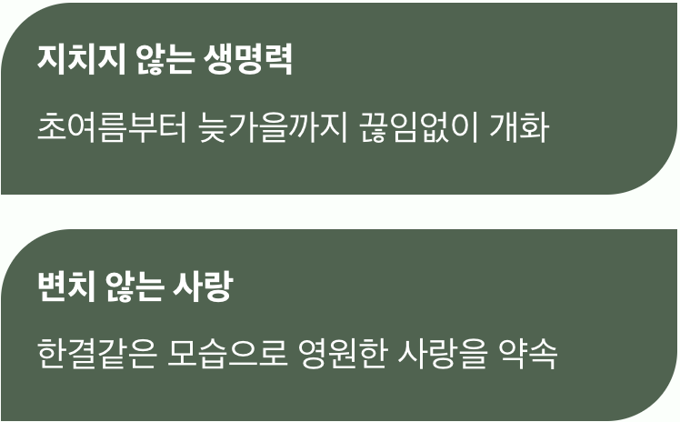 그래서 이 꽃은 남들이 알아주지 않는 길을 묵묵히 걷고 있는 사람, 혹은 자신의 신념을 지키기 위해 외로운 싸움을 하고 있는 이에게 더없이 큰 위로와 격려를 전합니다. “당신이 걷는 그 길이 맞습니다. 힘을 내세요!”라는 무언의 응원이 필요하다면, 이 굳건한 꽃을 떠올려 보세요. 그것이 바로 당신의 마음을 다잡아 줄 가장 확실한 해결책이 될 것입니다.