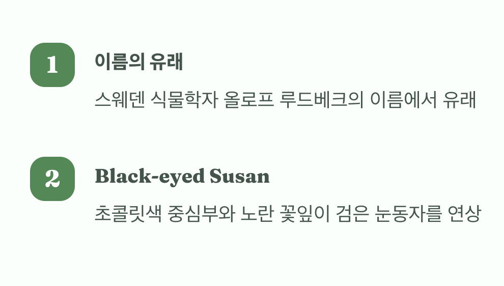 루드베키아라는 이름은 조금 낯설고 어렵게 느껴질 수 있습니다. 이 이름은 17세기의 스웨덴 식물학자인 올로프 루드베크(Olof Rudbeck)의 이름에서 따온 것입니다. 하지만 이 꽃은 훨씬 더 낭만적이고 사랑스러운 영어 이름, ‘Black-eyed Susan(검은 눈의 수잔)’으로 더 널리 알려져 있습니다.