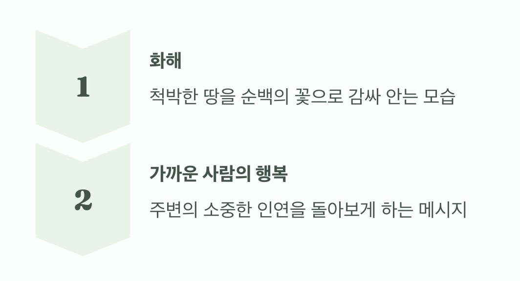 이 친숙한 모습은 우리에게 ‘평범함 속에 깃든 아름다움’을 일깨워 줍니다. 장미처럼 화려하지도, 백합처럼 향기롭지도 않지만, 우리 주변 가장 가까운 곳에서 소박한 아름다움을 뽐내는 망초꽃. 이처럼 이 작은 들꽃은 우리에게 행복이 멀리 있는 것이 아니라, 우리 주변의 작고 소소한 것들 속에 있다는 중요한 진리를 알려주는 해결책이 되어줍니다.