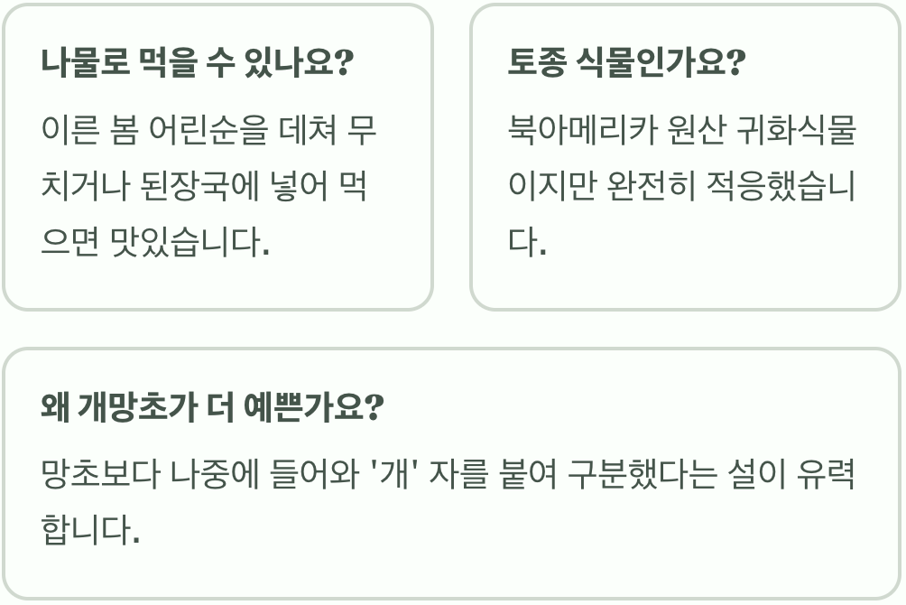 A. 식물 이름 앞에 붙는 ‘개’는 보통 ‘야생의’, ‘흔한’ 혹은 ‘품질이 떨어지는’ 이라는 의미로 쓰입니다. 하지만 망초와 개망초의 경우에는, 나라가 망할 무렵 들어온 ‘망초’보다 더 나쁜 풀이라는 의미로, 이미 들어와 있던 개망초에 ‘개’ 자를 붙여 구분했다는 설이 유력합니다.