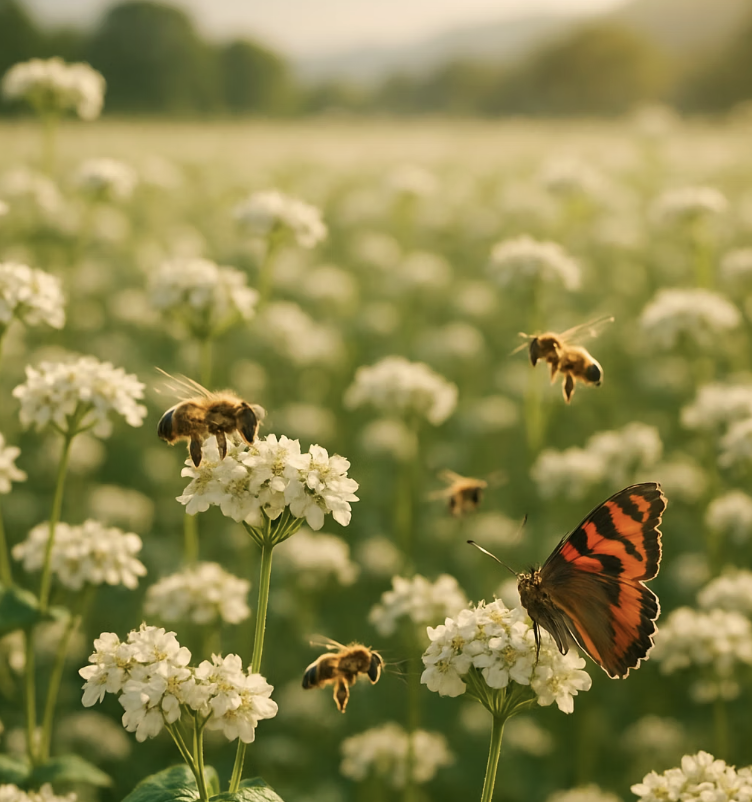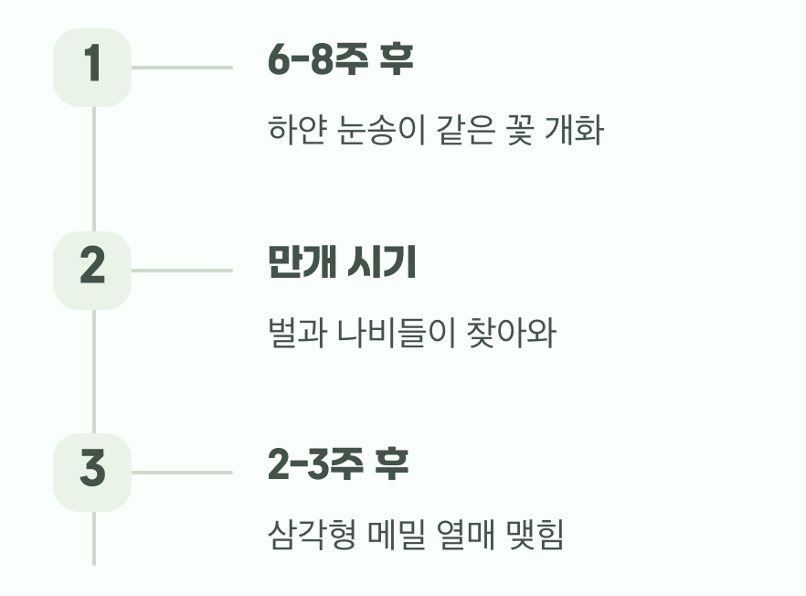 기다림에 지친 정원사에게 메밀은 최고의 선물입니다. 씨앗을 뿌린 후 약 6주에서 8주, 즉 두 달이 채 되지 않아 하얀 눈송이 같은 꽃들이 피어나기 시작합니다. 작은 꽃 하나하나는 앙증맞지만, 수백수천 송이가 한데 모여 바람에 흔들리는 모습은 그야말로 장관을 이룹니다. 이 시기에는 꿀을 찾는 벌과 나비들이 끊임없이 찾아와 정원에 활기를 더해줍니다.