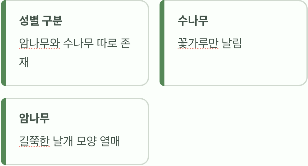 꽃을 관찰할 때 이 나무가 수나무인지 암나무인지 맞춰보는 것도 즐거운 놀이가 됩니다. 꽃가루만 잔뜩 날리고 있다면 수나무일 가능성이 크고, 나중에 길쭉한 날개 모양의 열매가 달린다면 암나무입니다. 열매를 맺지 못하는 나무를 보더라도 실망하지 말고, "아, 너는 꽃가루를 배달하는 멋진 수나무구나!"라고 이해해 주는 것이 자연을 배우는 올바른 태도입니다.