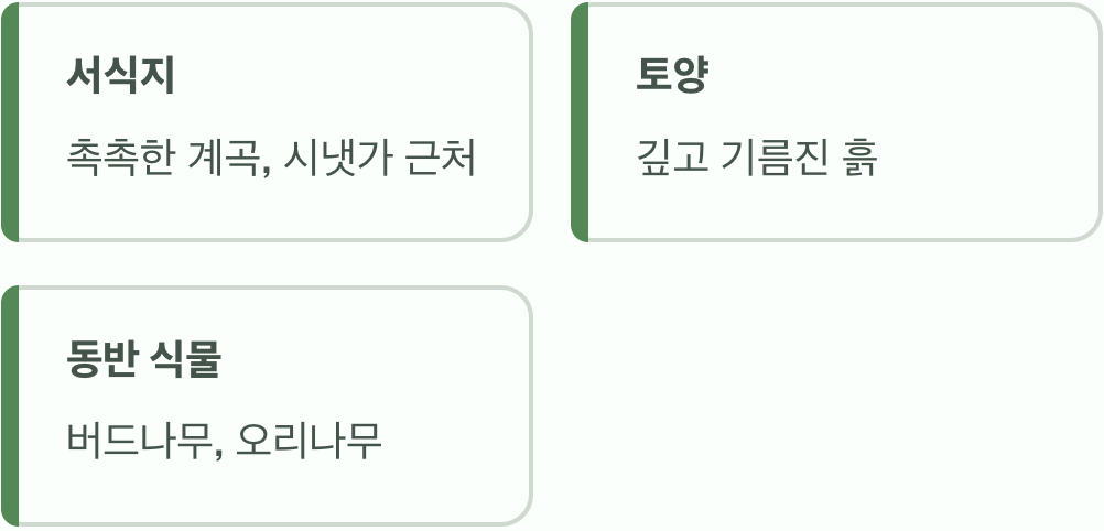 이름에 '물'자가 들어가는 것에서 알 수 있듯이, 이 나무는 물을 정말 좋아합니다. 건조하고 메마른 산등성이보다는 물기가 촉촉하게 배어있는 계곡 주변이나 시냇가 근처에서 쉽게 찾을 수 있습니다. 땅이 깊고 기름진 곳을 좋아해서 바위 틈보다는 흙이 많은 곳에 뿌리를 내립니다.