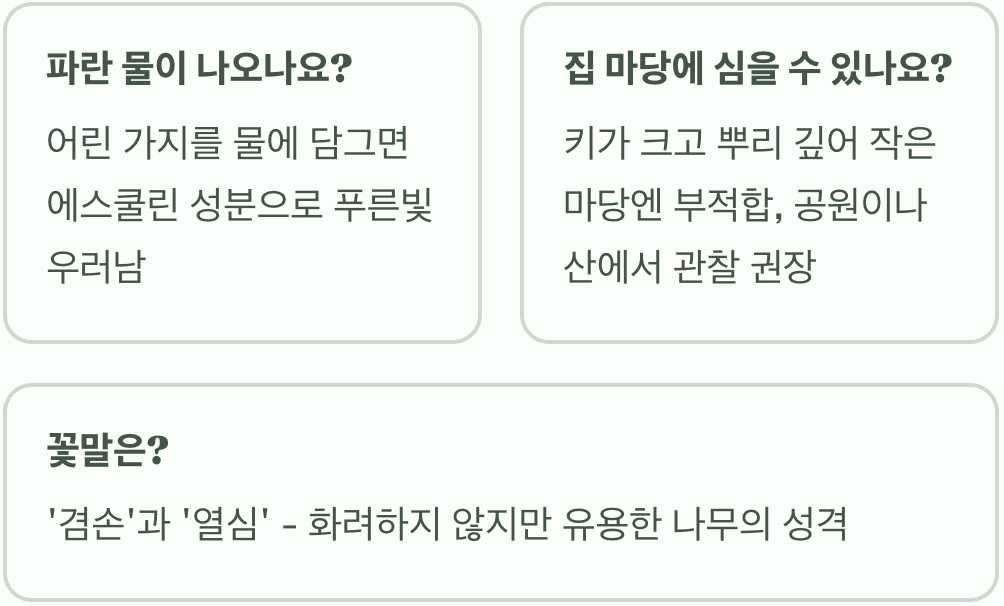 A. 네, 그렇습니다. 껍질을 벗긴 어린 가지를 맑은 물에 담그고 잠시 기다리면 잉크를 풀어놓은 것처럼 은은한 푸른빛이 우러나옵니다. 이것은 껍질 속에 있는 '에스쿨린'이라는 성분 때문인데, 실제로 눈으로 보면 아주 신기한 마법 같습니다. 아이들과 함께 실험해 보면 잊지 못할 추억이 될 것입니다.