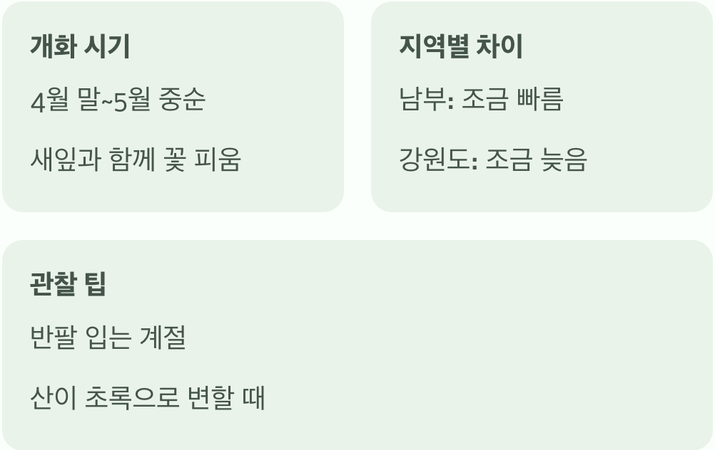 이 시기에 꽃을 보고 싶다면 달력을 확인하는 것보다 주변의 풍경을 살피는 것이 가장 좋은 해결책입니다. 사람들이 반팔을 입기 시작하고, 산의 색깔이 연두색에서 진한 초록색으로 넘어가려고 할 때 산책을 나가보세요. 너무 이른 봄에 가면 앙상한 가지만 보게 되니, 날씨가 충분히 따뜻해졌을 때를 노려야 실패 없이 만날 수 있습니다.