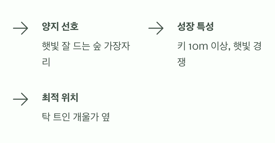 물을 좋아한다고 해서 어둡고 침침한 곳을 좋아하는 것은 아닙니다. 오히려 햇빛을 아주 사랑하는 '양수'에 속합니다. 그늘진 곳에서는 잘 자라지 못하거나 꽃을 피우지 못해 시들시들해지기 십상입니다. 키가 10미터 넘게 쑥쑥 자라는 이유도 더 많은 햇빛을 받기 위해서 경쟁하기 때문입니다.