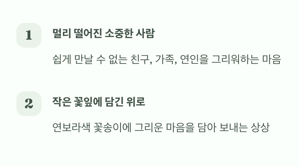 기다림의 정서는 조금 더 구체적인 의미로 확장됩니다. 바로 ‘먼 곳의 친구를 그리워한다’는 꽃말입니다. 예전처럼 쉽게 만날 수 없는, 멀리 떨어져 지내는 친구나 가족, 연인에 대한 애틋한 마음을 이 꽃에 빗대어 표현한 것입니다.
