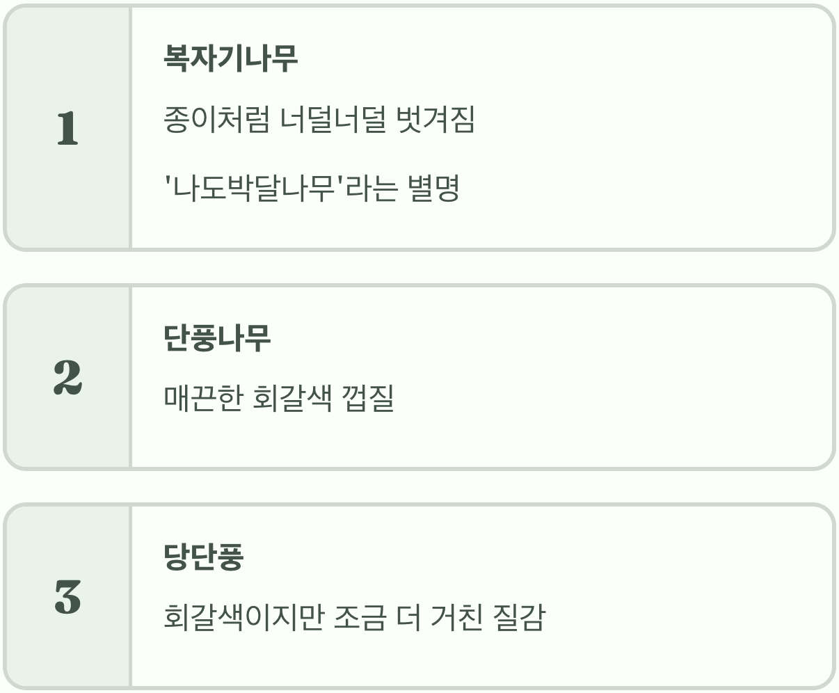 잎사귀만으로 구분이 애매할 때는 나무의 줄기, 즉 수피(나무껍질)를 살펴보세요. 세 나무는 저마다 다른 질감의 옷을 입고 있습니다. 복자기나무는 껍질이 종이처럼 너덜너덜하게 벗겨지는 독특한 특징이 있습니다. '나도박달나무'라는 다른 이름이 있을 정도죠.