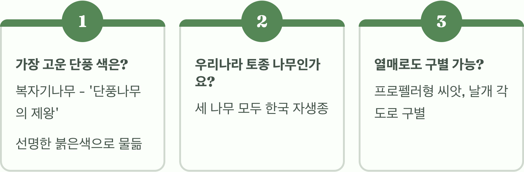 A. 네, 가능합니다. 세 나무 모두 프로펠러처럼 생긴 날개 달린 씨앗(시과)을 맺지만, 두 날개가 벌어진 각도가 조금씩 다릅니다. 하지만 잎 모양으로 구별하는 것이 초보자에게는 훨씬 쉽고 직관적인 방법입니다.