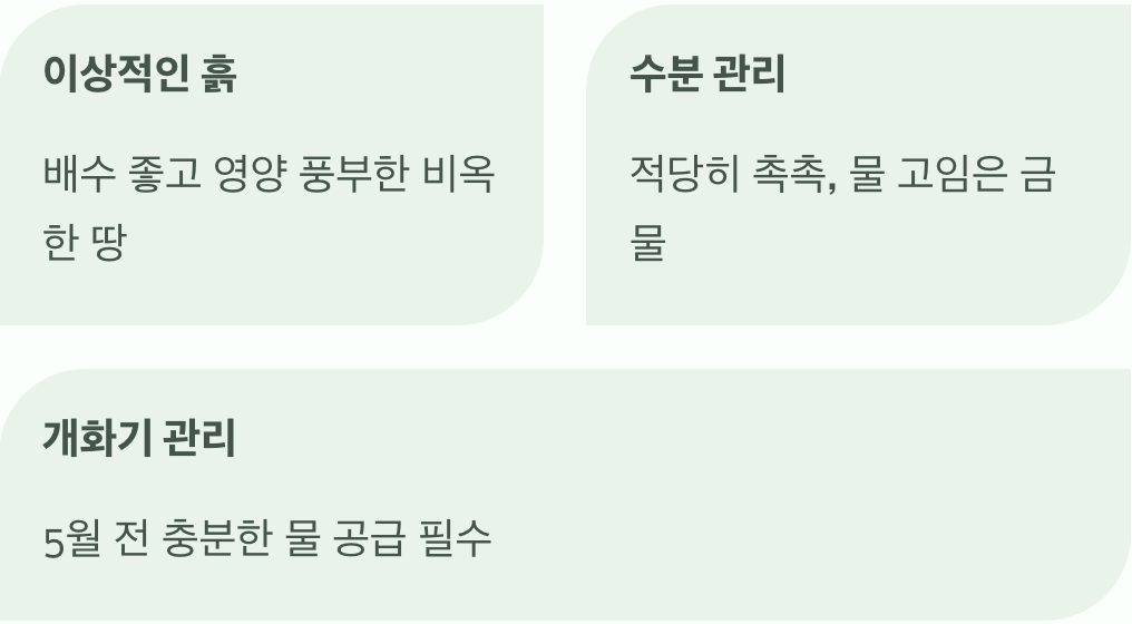조경수로 심을 계획이시라면 물 빠짐이 좋은 곳을 선택하고, 봄철 가뭄이 심할 때는 물을 충분히 주어야 합니다. 흙 속에 수분이 부족하면 나무가 생존을 위해 꽃을 피우는 것을 포기해 버릴 수도 있습니다. 5월 개화기 직전에는 특히 수분 관리에 신경을 써주는 것이 풍성한 꽃을 보는 노하우입니다.