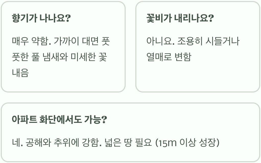 A. 아니요, 벚꽃처럼 꽃잎이 흩날리며 떨어지는 장관은 연출되지 않습니다. 꽃 자체가 작고 단단하게 뭉쳐 있다가 수정이 끝나면 시들어서 조용히 떨어지거나 열매로 변합니다. 화려한 엔딩보다는 열매를 맺기 위한 실용적인 꽃이라고 보시면 됩니다.