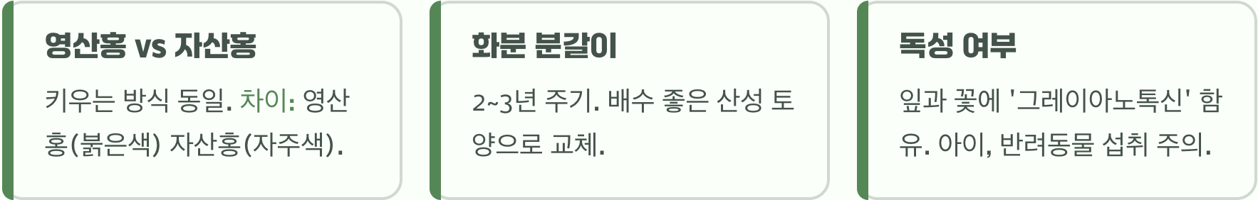A. 둘 다 철쭉의 한 종류인 왜성종으로 키우는 방식은 거의 같습니다. 가장 큰 차이는 꽃 색깔입니다. ‘영산홍’은 주로 붉은색 계열의 꽃을 피우는 품종을 통칭하고, ‘자산홍’은 이름 그대로 자주색(보라색) 계열의 꽃을 피우는 품종을 말합니다.