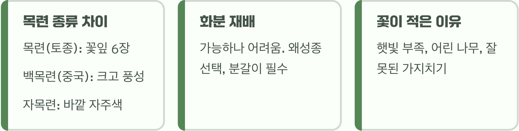 A. 모두 목련의 한 종류입니다. ‘목련’은 우리나라 토종으로 꽃잎이 6장이고 활짝 벌어지며, ‘백목련’은 중국 원산으로 꽃잎이 더 크고 풍성하며 위를 향해 오므리듯 핍니다. 우리가 흔히 보는 것은 대부분 백목련입니다. ‘자목련’은 이름 그대로 꽃잎 바깥쪽이 짙은 자주색을 띠는 품종을 말합니다.
