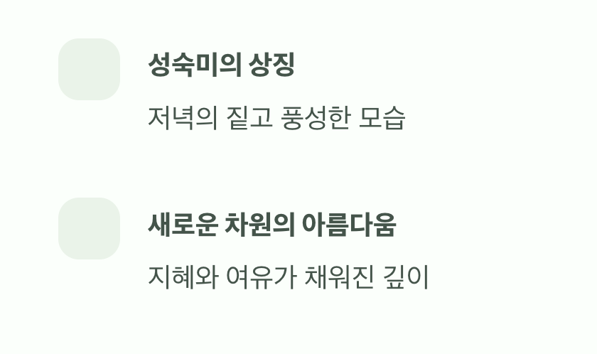 예로부터 부용화는 시와 그림 속에서 아름다운 여인의 상징으로 자주 등장했습니다. 이는 단순히 겉모습이 화려해서가 아니라, 연꽃처럼 청초하면서도 기품 있는 자태를 지녔기 때문입니다. 이처럼 이 꽃의 이름 속에는 겉으로 드러나는 화려함보다 내면에서 우러나오는 우아함의 가치를 알아보라는 옛사람들의 지혜가 담겨 있습니다.
