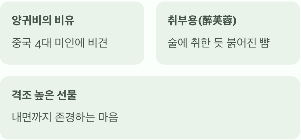 예로부터 부용화는 중국의 4대 미인 중 한 명인 양귀비에 비유될 만큼, 아름다운 여인을 칭송하는 대표적인 꽃이었습니다. 아침과 저녁의 모습이 달라 ‘취부용(醉芙蓉)’ 즉, ‘술에 취한 부용’이라고도 불렸는데, 이는 마치 아름다운 여인이 술에 살짝 취해 뺨이 붉어진 매혹적인 모습과 같다고 여겼기 때문입니다.