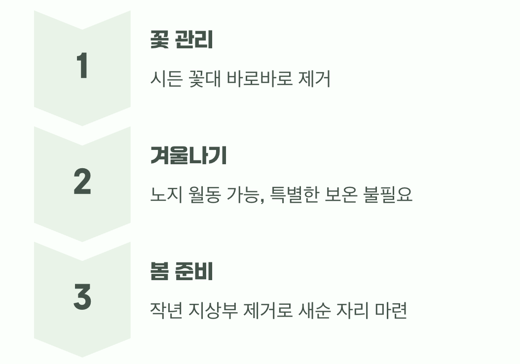 늦가을, 서리가 내리면 지상부의 잎과 줄기는 모두 시들지만, 땅속의 뿌리는 살아남아 겨울잠에 들어갑니다. 특별한 보온 조치 없이도 우리나라 대부분 지역에서 '노지 월동'이 가능할 만큼 추위에 강합니다. 봄이 되면 작년에 남았던 지상부를 깨끗하게 잘라내어 새순이 올라올 자리를 마련해 주는 것만으로 겨울나기 준비는 충분합니다.