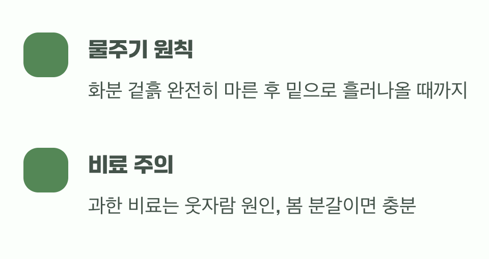 토양은 가리지 않고 잘 자라는 편이지만, 딱 한 가지 아주 싫어하는 것이 있습니다. 바로 '과습'입니다. 뿌리가 계속 물에 잠겨있는 것을 견디지 못하므로, 반드시 물 빠짐이 좋은 흙에 심어야 합니다. 웬만한 척박한 땅에서도 잘 자라지만, 배수만은 꼭 신경 써주는 것이 좋습니다.