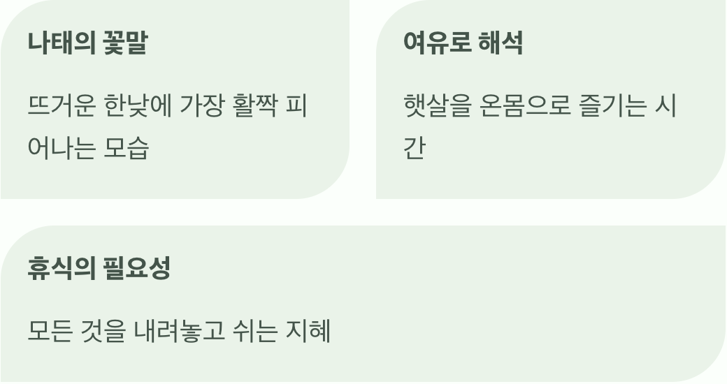하지만 이 ‘나태’를 ‘여유’라는 단어로 바꾸어 생각해 보면 어떨까요? 모두가 바쁘게 움직이는 세상 속에서, 잠시 모든 것을 잊고 햇살을 온몸으로 즐기는 여유. 송엽국은 우리에게 때로는 모든 것을 내려놓고 나른한 휴식을 즐기는 시간이 필요하다는 것을, 아주 직관적인 방법으로 알려주고 있습니다.