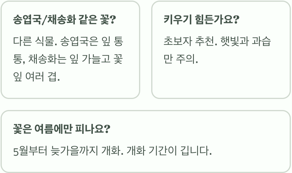A. 보통 5월부터 피기 시작하여 여름 내내 가장 왕성하게 피고, 늦가을까지도 꾸준히 꽃을 보여줍니다. 이름에 ‘사철’이라는 말이 붙어 ‘사철채송화’라고도 불릴 만큼 개화 기간이 매우 긴 편입니다.