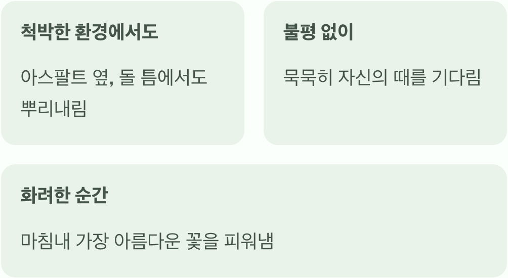 혹시 지금 무언가 힘든 일을 겪고 있거나, 끝이 보이지 않는 노력에 지쳐있나요? 그렇다면 잠시 멈춰 서서 이 작은 꽃을 들여다보세요. 척박한 환경을 탓하지 않고 묵묵히 자신의 때를 기다려 마침내 가장 화려한 순간을 만들어내는 송엽국의 모습은, 당신의 지친 마음에 ‘조금만 더 힘을 내’라는 따뜻한 위로와 격려를 건네줄 것입니다.