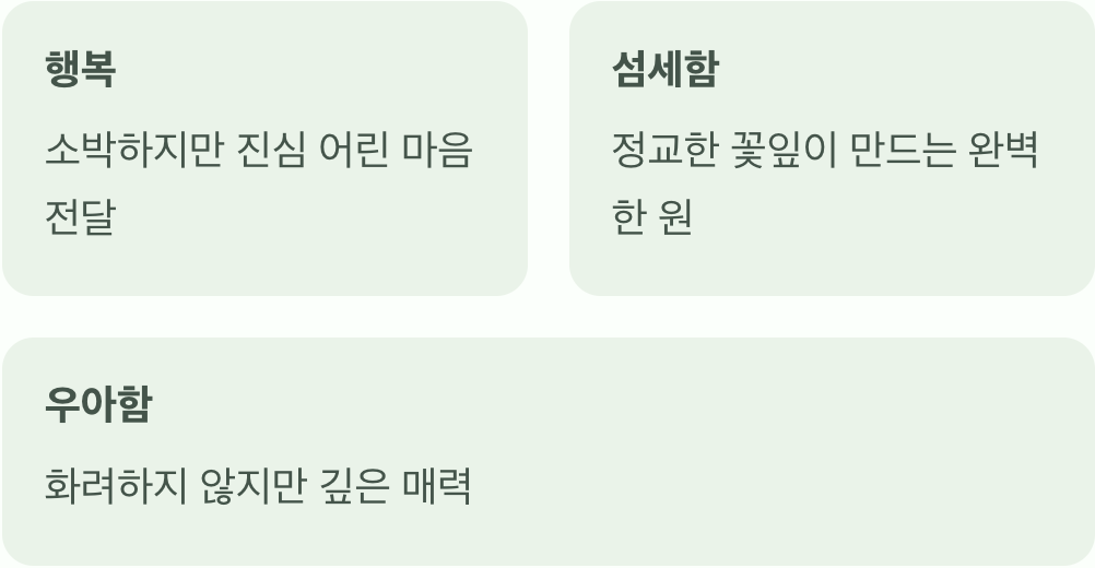 이 식물이 가진 가장 대표적인 꽃말은 바로 '행복'과 '섬세함'입니다. 화려하게 자신을 뽐내지는 않지만, 자세히 들여다볼수록 정교하게 갈라진 꽃잎들이 모여 하나의 완벽한 원을 이루고 있는 모습이 참으로 매력적입니다. 이러한 모습 때문에 '미모'나 '우아함'을 상징하기도 합니다.