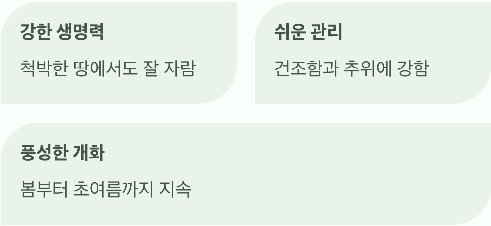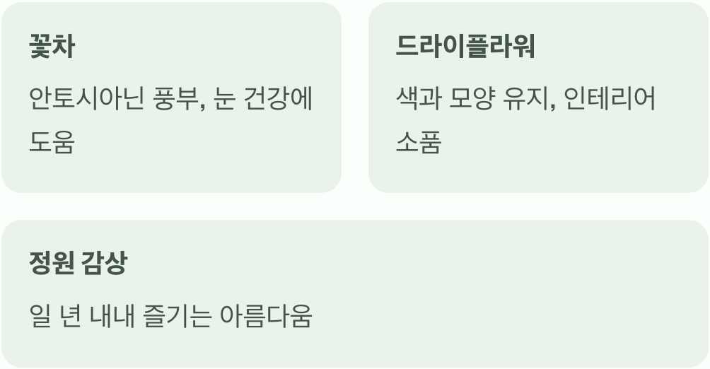 꽃이 시드는 것이 아쉽다면 드라이플라워로 만들어보세요. 수분이 적은 편이라 거꾸로 매달아 말리면 본래의 색과 모양이 거의 변하지 않고 예쁘게 마릅니다. 인테리어 소품으로 활용하거나 엽서에 장식하면 일 년 내내 그 아름다움을 즐길 수 있습니다. 정원 감상부터 차 한 잔의 여유까지, 버릴 것 하나 없는 이 식물로 일상을 더욱 풍요롭게 채워보시길 바랍니다.