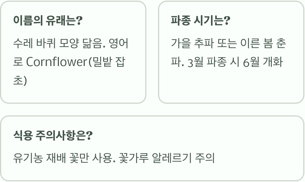 A. 꽃의 생김새를 자세히 보면 방사형으로 퍼진 꽃잎들이 마치 수레의 바퀴(Wheel) 모양을 닮았다고 해서 붙여진 이름입니다. 영어로는 콘플라워(Cornflower)라고 부르는데, 이는 유럽의 밀(Corn) 밭이나 곡물밭 사이에서 흔하게 자라는 잡초였기 때문에 유래되었습니다.
