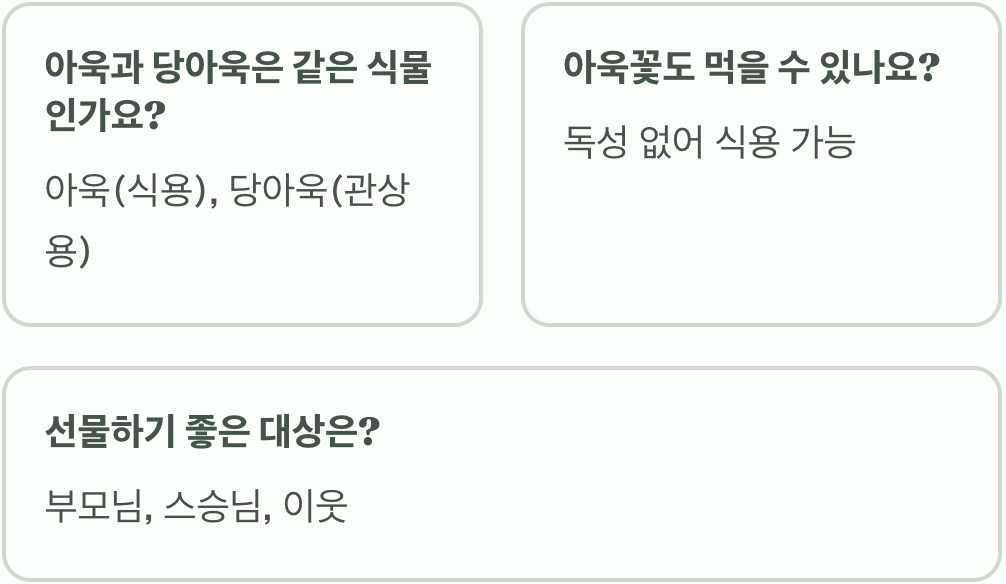 A. 엄밀히 말하면 다른 종류이지만, 아주 가까운 친척입니다. 둘 다 아욱과(Malvaceae)에 속하는 식물로, 비슷한 생김새와 성질을 공유합니다. 우리가 주로 먹는 것은 ‘아욱(Malva verticillata)’이고, 관상용으로 많이 심는 꽃은 ‘당아욱(Malva sylvestris)’이나 ‘접시꽃’ 등입니다. 하지만 꽃말은 대부분 ‘온화함’, ‘자애’ 등 비슷한 의미로 통용됩니다.