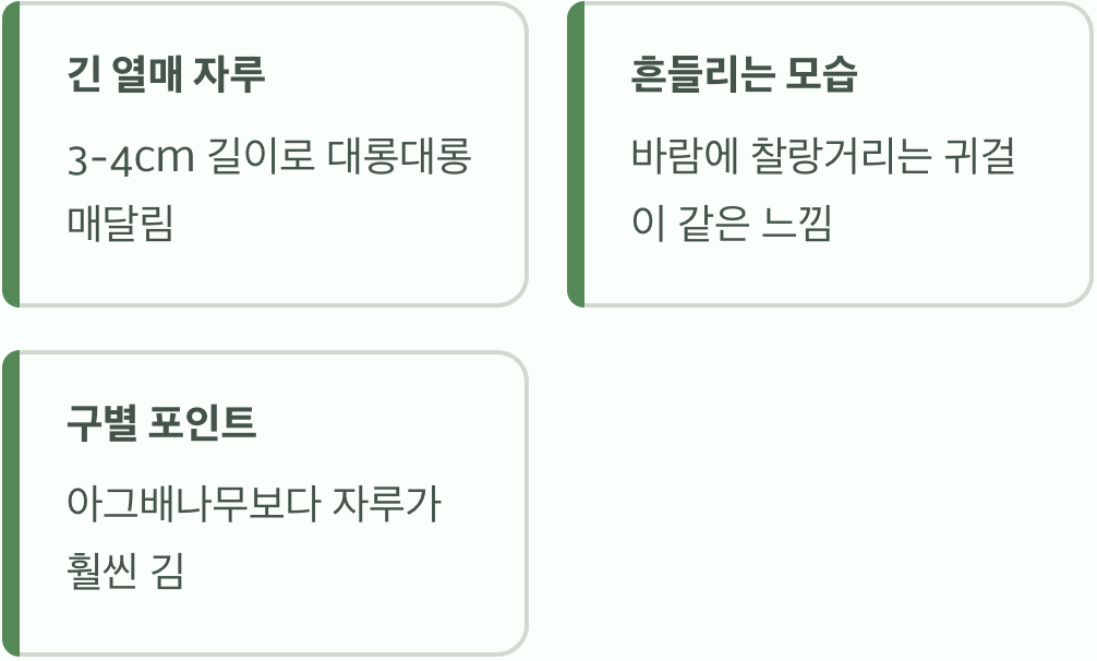 그래서 바람이 불 때마다 열매들이 찰랑찰랑 흔들리는 모습이 아주 인상적입니다. 마치 귀걸이가 흔들리는 것 같기도 하고, 작은 종이 매달린 것 같기도 합니다. 비슷하게 생긴 '아그배나무'와 헷갈린다면 이 자루의 길이를 비교해 보는 것이 좋은 해결책입니다. 야광나무의 자루가 훨씬 길고 우아하게 늘어져 있는 것을 확인할 수 있습니다.