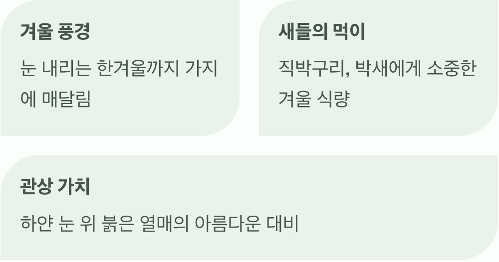 이렇게 오랫동안 매달려 있는 덕분에 먹이가 부족한 겨울철, 직박구리나 박새 같은 산새들에게 소중한 식량이 되어줍니다. 새들이 날아와 열매를 쪼아 먹는 모습을 관찰하는 것도 겨울 산책의 묘미입니다. 자연을 위해, 그리고 아름다운 풍경을 위해 따지 말고 눈으로만 감상하거나 새들에게 양보해 주는 것이 가장 현명한 방법입니다.