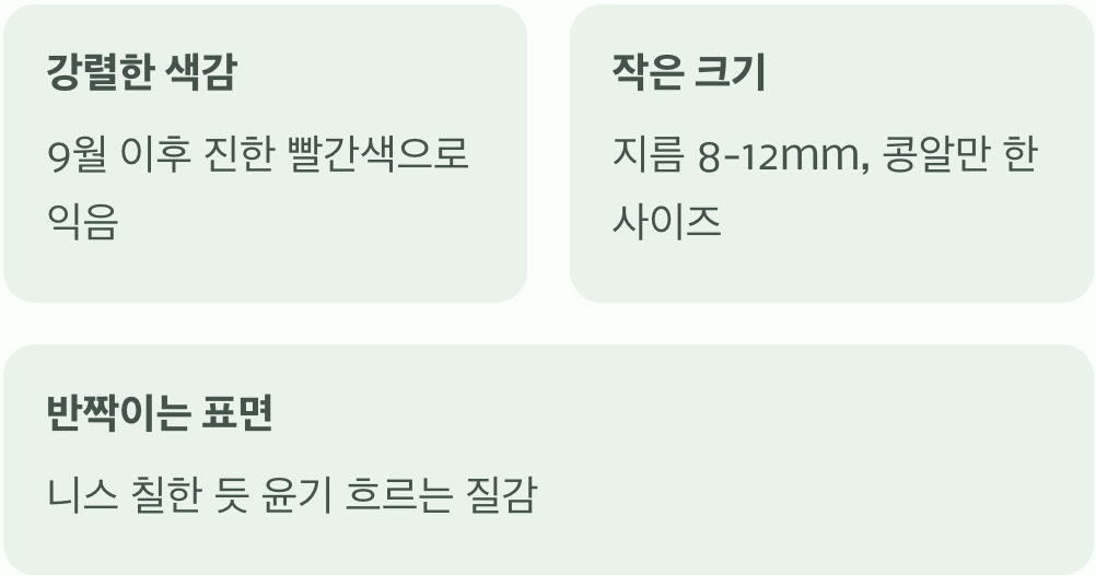 표면을 자세히 들여다보면 니스 칠을 해놓은 것처럼 반질반질한 윤기가 흐릅니다. 햇빛을 받으면 투명한 루비 보석처럼 빛나서 관상용으로 아주 인기가 높습니다. 만약 길을 가다가 잎은 시들었는데 유독 반짝이는 빨간 알맹이들이 가득 달려 있다면, 주저하지 말고 가까이 가서 구경해 보세요. 그 영롱한 색감에 금방 마음을 빼앗기게 될 것입니다.