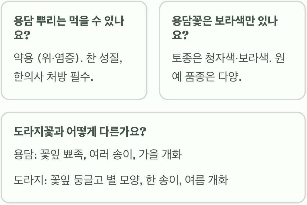 A. 네, 하지만 약으로만 사용해야 합니다. 용담의 뿌리는 ‘용담초’라는 이름의 아주 중요한 한약재로, 매우 쓴맛을 내는 겐티오피크린 등의 성분이 함유되어 있어 위를 튼튼하게 하고 염증을 가라앉히는 데 탁월한 효능이 있습니다. 다만, 성질이 매우 차갑기 때문에 몸이 찬 사람은 함부로 복용해서는 안 되며, 반드시 한의사의 처방에 따라 사용해야 합니다.