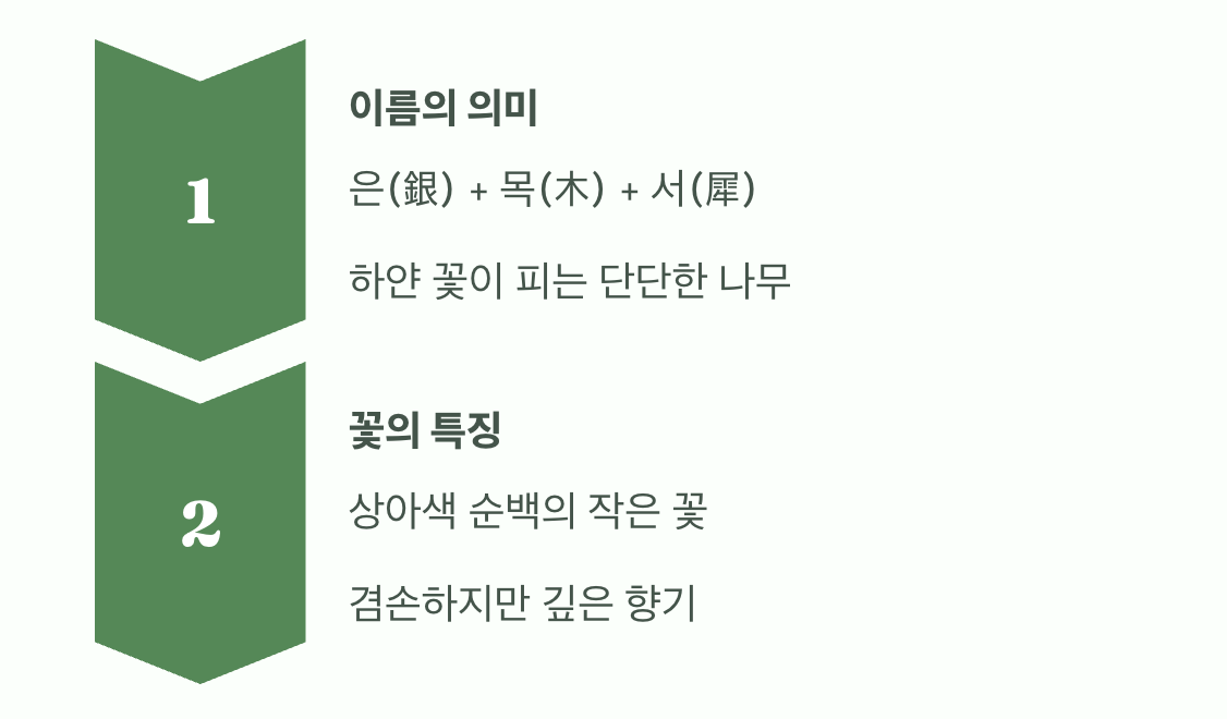 가을이 깊어지면 어디선가 바람을 타고 날아온, 맑고 깨끗하면서도 달콤한 향기에 문득 발걸음을 멈추게 되는 순간이 있습니다. 향기를 따라 고개를 돌려보면, 그곳에는 화려한 꽃 대신 짙푸른 나뭇잎 사이로 소복이 쌓인 눈처럼 피어난 자그마한 흰 꽃들이 있을 뿐입니다. 바로 ‘은목서(銀木犀)’입니다.