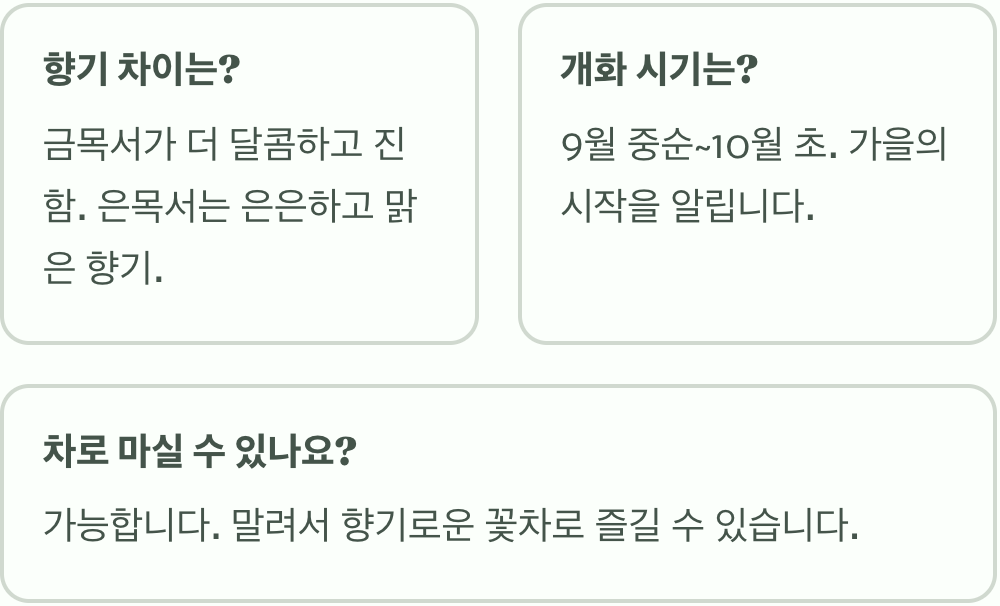 A. 네, 가능합니다. 금목서와 마찬가지로 은목서꽃도 말려서 향기로운 꽃차로 즐길 수 있습니다. 다만, ‘계화차(桂花茶)’라는 이름으로 더 널리 알려진 것은 향이 더 진한 금목서꽃입니다.
