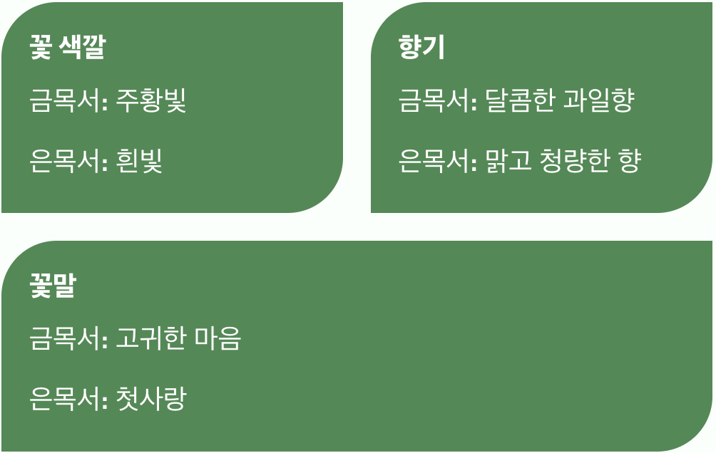 향기 역시 미묘하게 달라서, 금목서가 복숭아나 살구 같은 달콤한 과일 향에 가깝다면, 은목서는 조금 더 시원하고 청량감이 느껴지는 맑은 향을 냅니다. 꽃말 또한 금목서가 ‘당신의 마음은 고귀합니다’라는 존경의 의미가 강하다면, 은목서는 ‘첫사랑’이라는 순수한 감정에 더 초점이 맞춰져 있습니다. 이 둘의 차이를 아는 것은, 당신의 마음에 꼭 맞는 메시지를 선택하는 데 도움을 줄 것입니다.