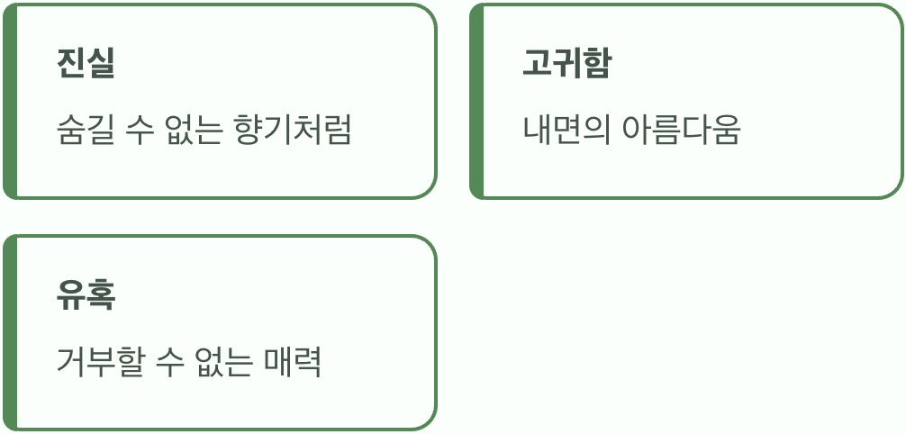 은목서는 ‘진실’과 ‘고귀함’, 그리고 때로는 거부할 수 없는 매력을 뜻하는 ‘유혹’이라는 꽃말도 함께 가지고 있습니다. 이는 아무리 작은 꽃이라도 그 향기는 숨길 수 없는 것처럼, 진실한 마음과 고귀한 인품은 언젠가 반드시 주변 사람들에게 알려지게 된다는 의미를 담고 있습니다.