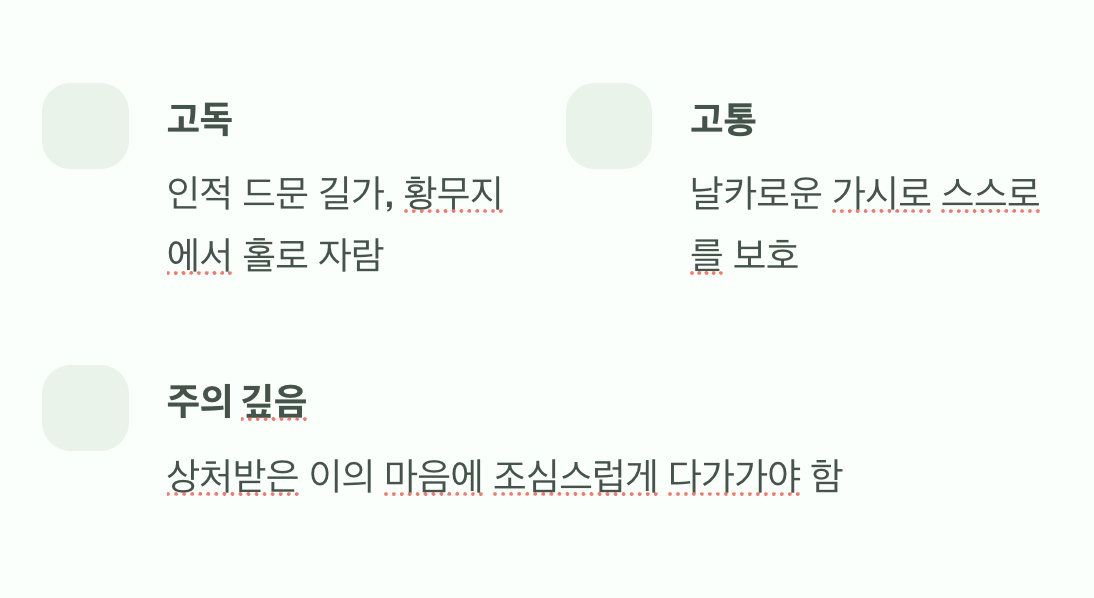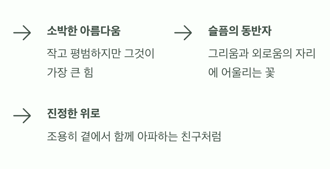 아름다운 꽃과 향기를 가졌지만, 함부로 다가서면 상처를 입을 수 있다는 이 모습. 이는 사랑하는 가족을 잃은 슬픔과 고통 속에서, 스스로를 지키기 위해 마음의 벽을 세운 사람의 모습을 떠올리게 합니다. 그래서 찔레꽃은 우리에게 상처받은 이의 마음에 다가갈 때는, 그 아픔을 이해하고 조심스럽게 다가가야 한다는 ‘주의 깊음’의 미덕을 가르쳐 줍니다.