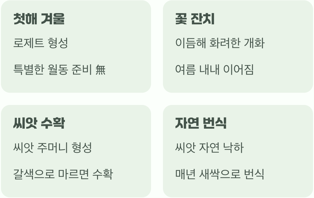 두 번째 해에 화려한 꽃 잔치가 끝나고 나면, 꽃이 졌던 자리에 동그란 씨앗 주머니가 열립니다. 이 주머니가 갈색으로 바싹 마를 때까지 기다렸다가 수확하여 종이봉투에 보관하면, 다음 해를 기약할 수 있습니다. 하지만 가장 쉬운 방법은 그냥 그대로 두는 것입니다. 씨앗이 자연스럽게 땅에 떨어져, 매년 그 자리에서 새로운 싹을 틔우며 우리와의 만남을 이어갈 것입니다.