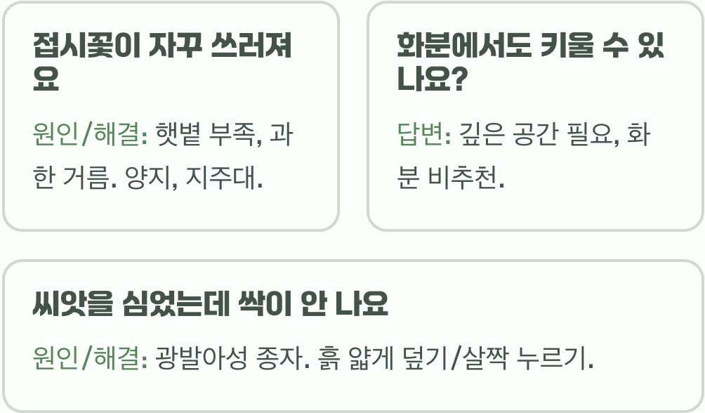 A. 접시꽃 씨앗은 빛이 있어야 싹이 트는 '광발아성' 종자입니다. 씨앗을 뿌린 뒤 흙을 너무 두껍게 덮으면 싹이 트지 않을 수 있습니다. 씨앗을 뿌린 뒤 흙을 살짝 덮어주거나, 흙 위에 그대로 두고 가볍게 눌러주는 것이 좋습니다.