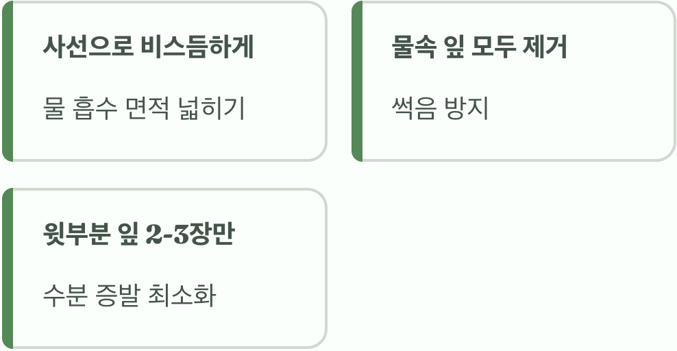 또한 물에 잠기는 부분에 있는 잎사귀들은 과감하게 모두 떼어내야 합니다. 잎이 물속에 들어가면 금방 썩어서 물을 오염시키고, 결국 가지 전체를 병들게 만들기 때문입니다. 물 위로 나온 윗부분의 잎도 2~3장만 남기고 나머지는 제거하거나 잎의 크기를 반으로 잘라주세요. 잎이 많으면 수분이 날아가서 가지가 금방 말라버리니 수분 증발을 막는 현명한 방법입니다.