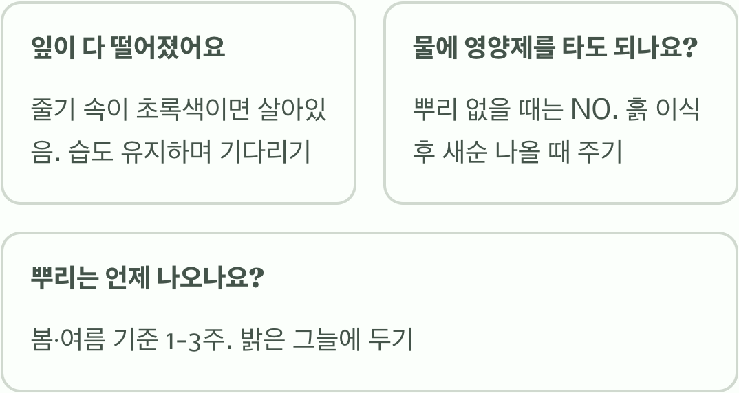 A. 잎이 말라서 떨어졌다고 해서 바로 포기하지 마세요. 줄기를 손톱으로 살짝 긁어보았을 때 안쪽 속살이 초록색이고 촉촉하다면 아직 살아있는 것입니다. 습도 유지를 계속해주면서 기다리면 앙상한 가지에서 다시 새순이 돋아날 수 있습니다. 하지만 줄기가 검게 변하고 쭈글쭈글해졌다면 실패한 것입니다.